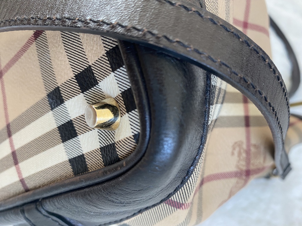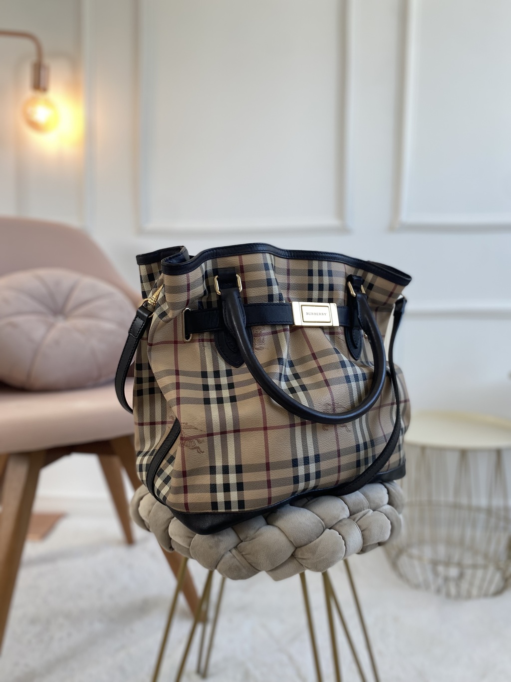 Bolsa Burberry Haymarket Check Belted na cor bege com estampa Haymarket Check da marca, possui três compartimentos internos sendo um deles com fechamento por zíper, três bolsos internos, alça de ombro e de mão em couro e ferragens em tom dourado.