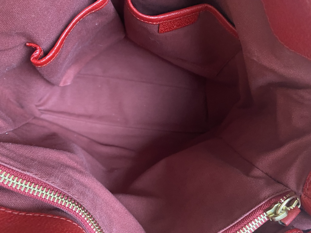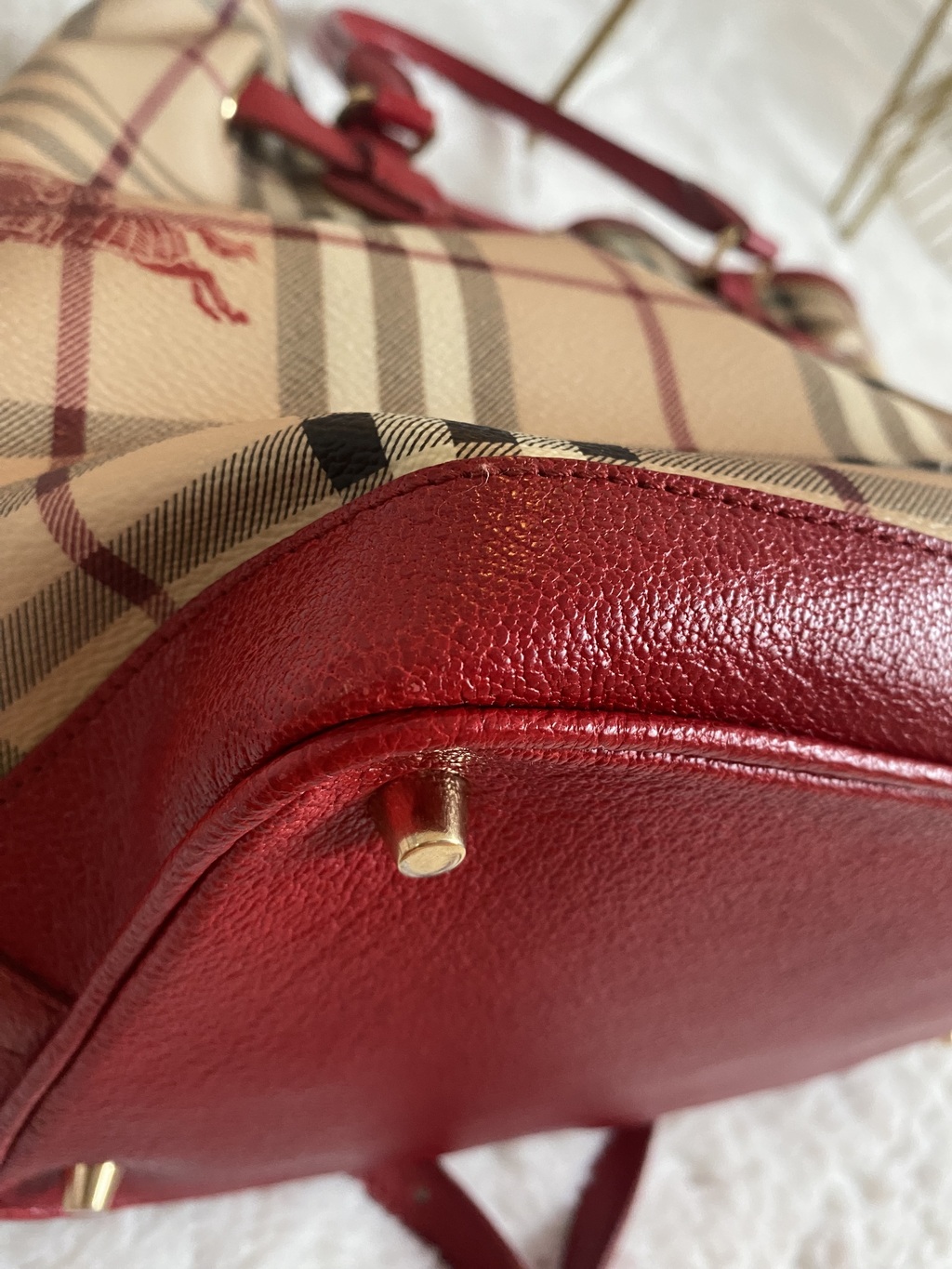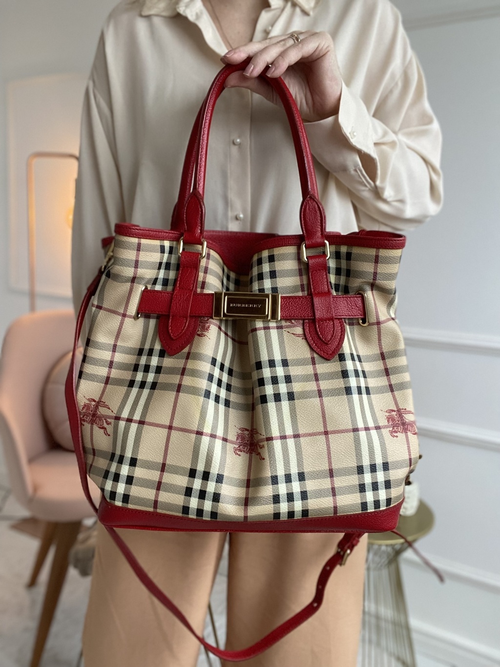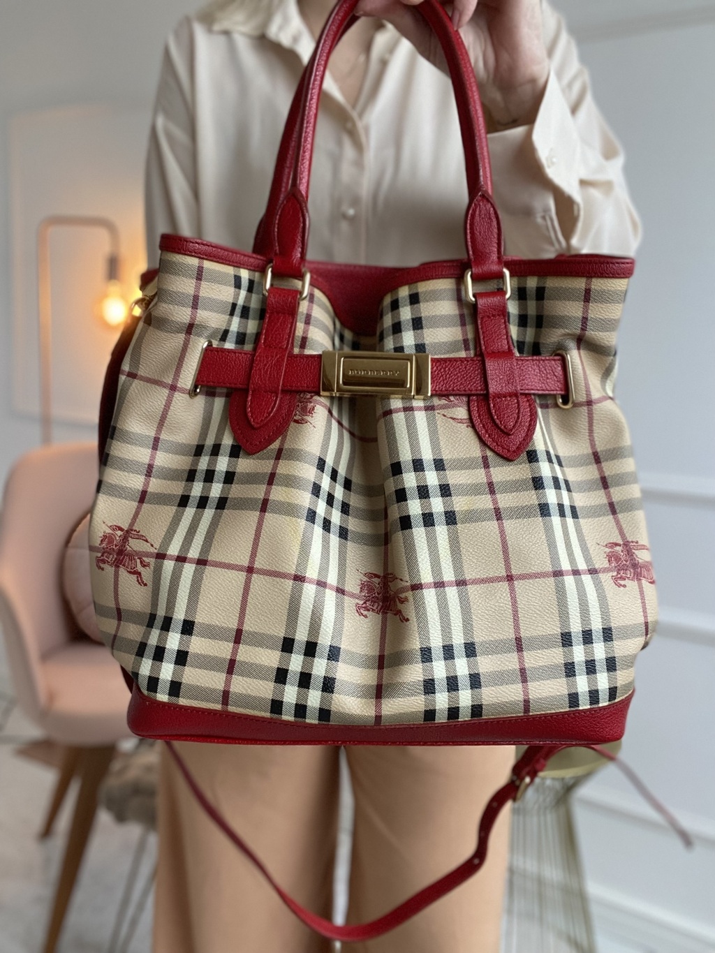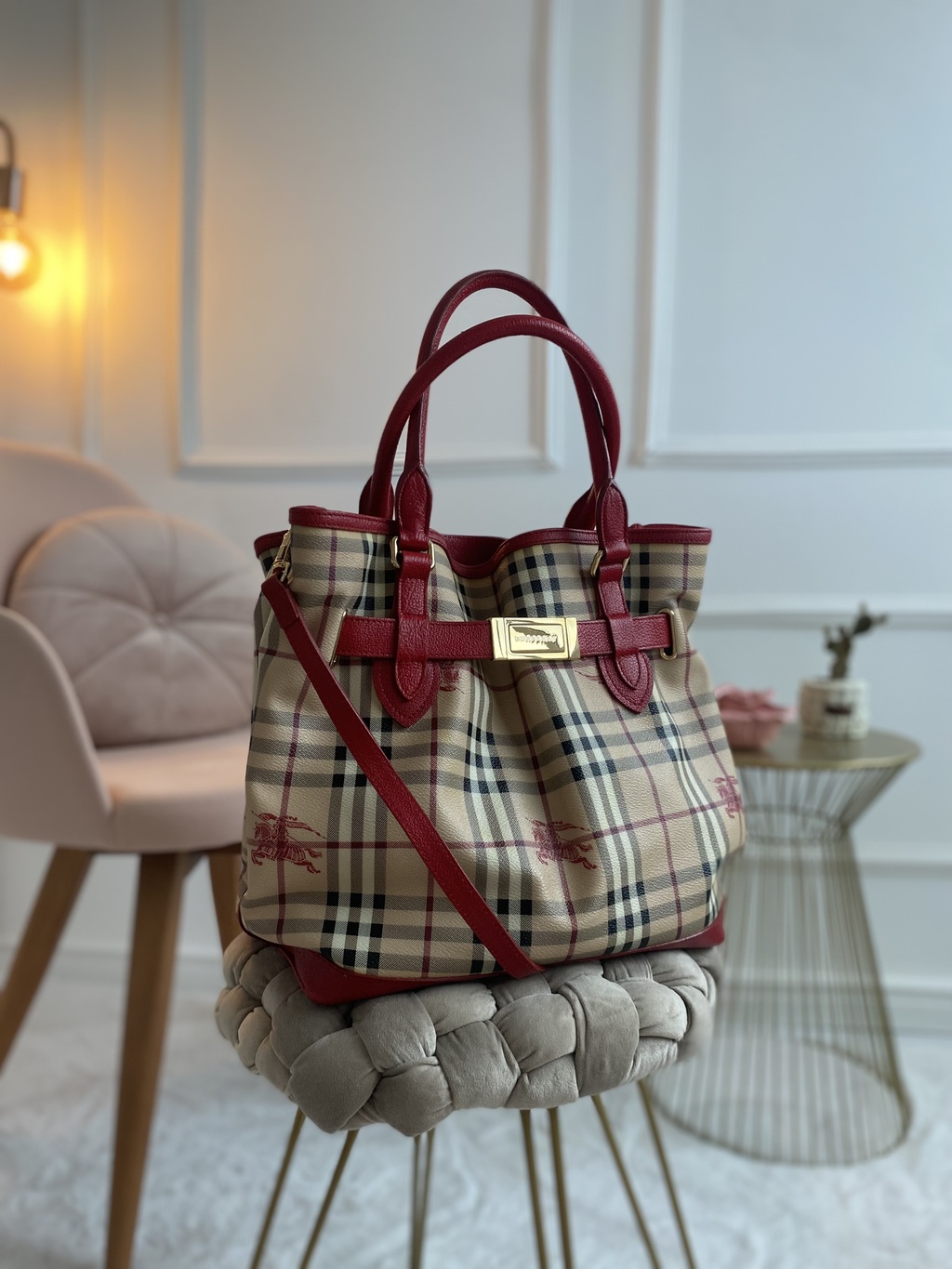 Satchel Buberry em Canvas Haymarket Check e couro vermelho;Ferragens douradas;Alça dupla de mão e alça longa, ajustável e removível de ombro;Compartimento duplo com quatro bolsos internos, sendo dois abertos e dois fechados por cursor;Fechamento por tira de ajuste com fecho de encaixe.
