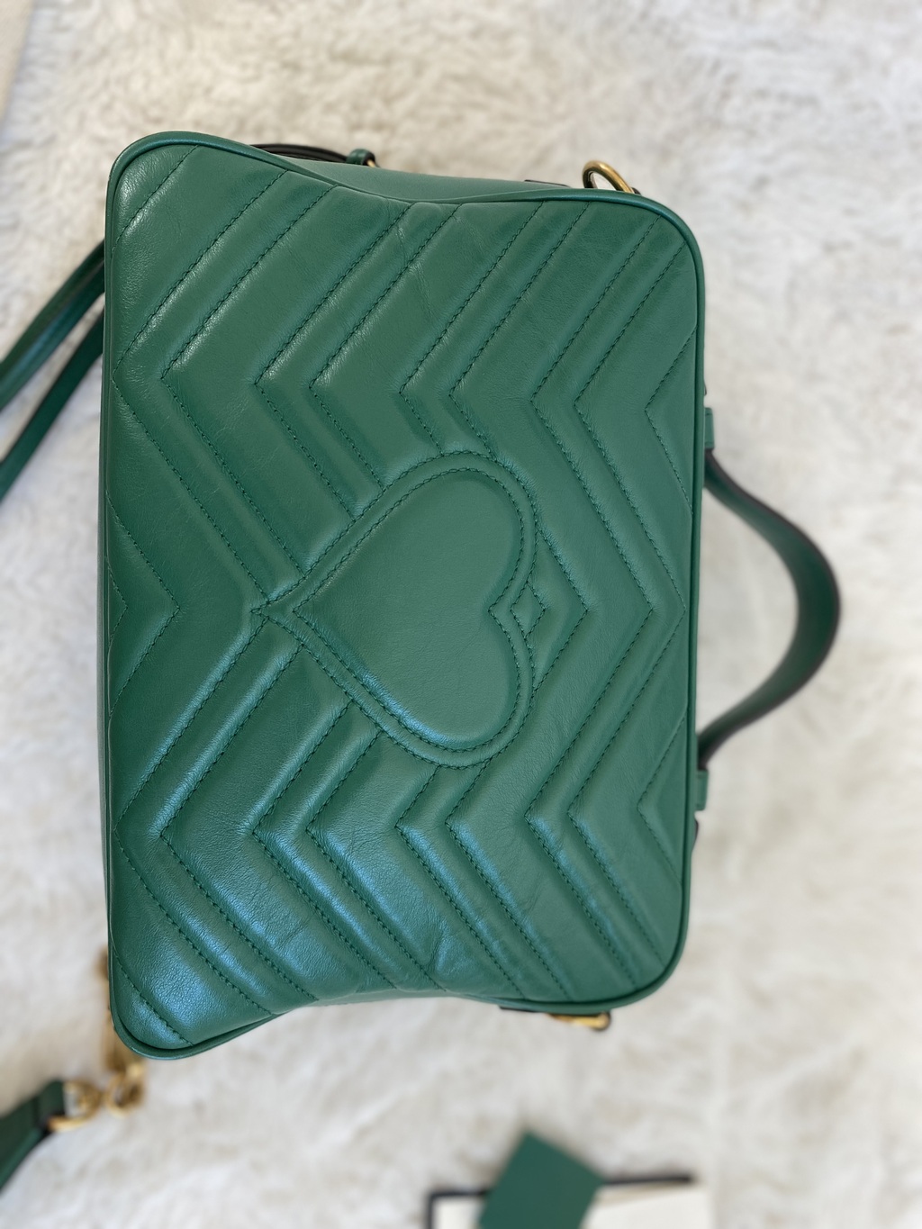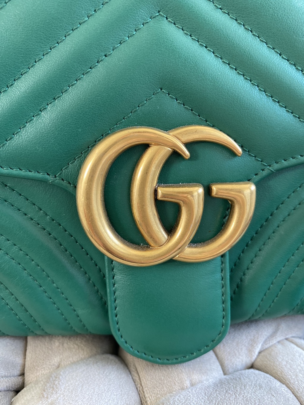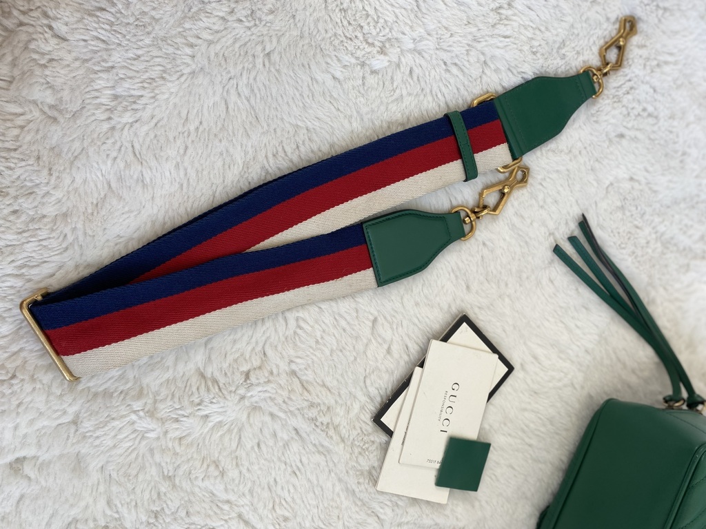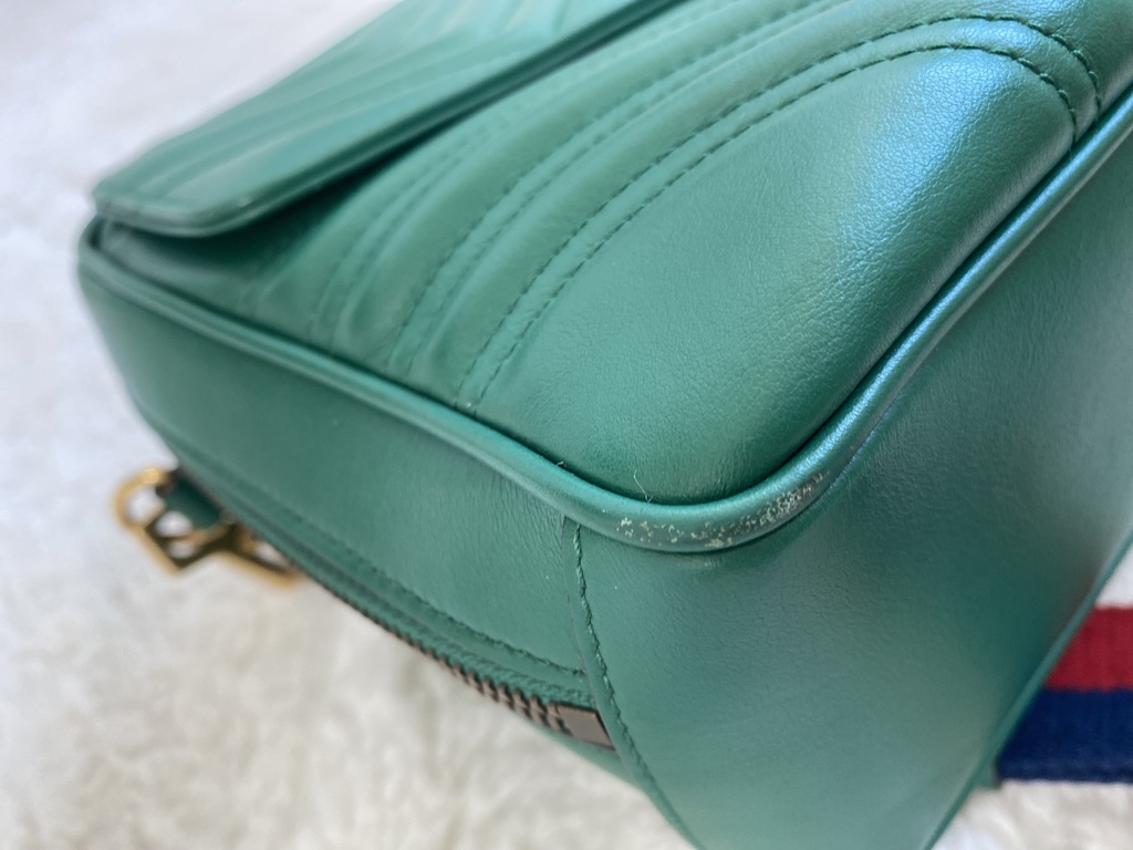 Satchel Gucci; Couro calfskin verde, matelassê Marmont e alça longa ; Ferragens douradas; Alça de mão e alça longa de ombro removível e regulável; Compartimento único com dois bolsos internos, sendo um aberto e um fechado por cursor e um bolso externo fechado por botão magnético; Fechamento por cursor.