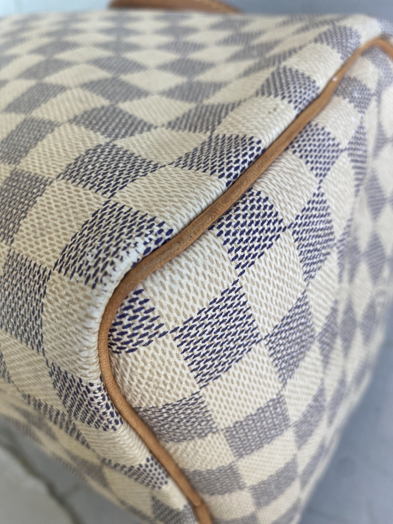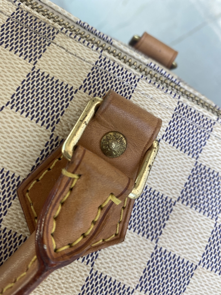 Handle bag Louis Vuitton em Canvas Damier Azur com couro Vachetta, Alça: Dupla de mão, Compartimento Único com um bolso interno aberto; Fechamento Por cursor, Ferragens Douradas, com aparência de usado. Apresenta canvas amarelado, desgastes nos cantos da base, manchas nas alças e na parte interna.