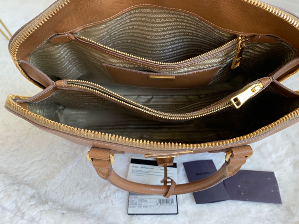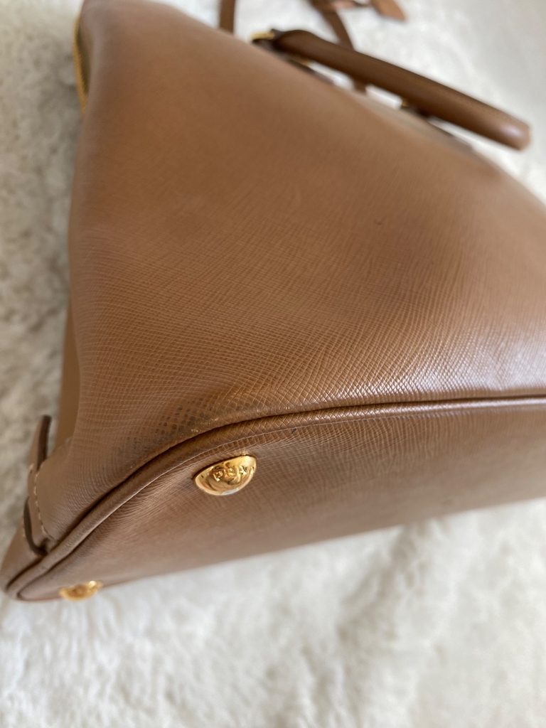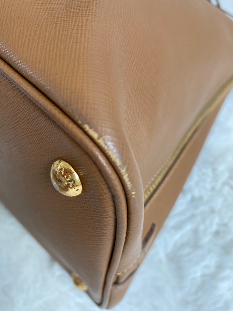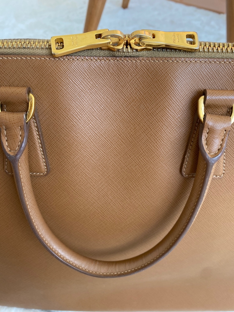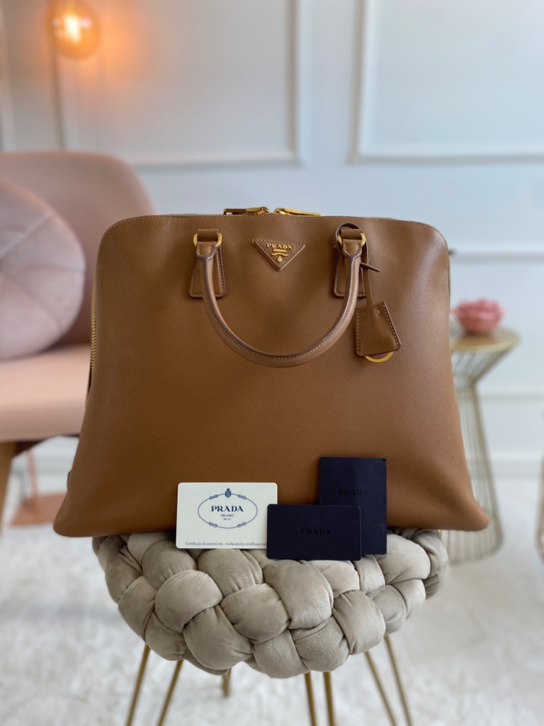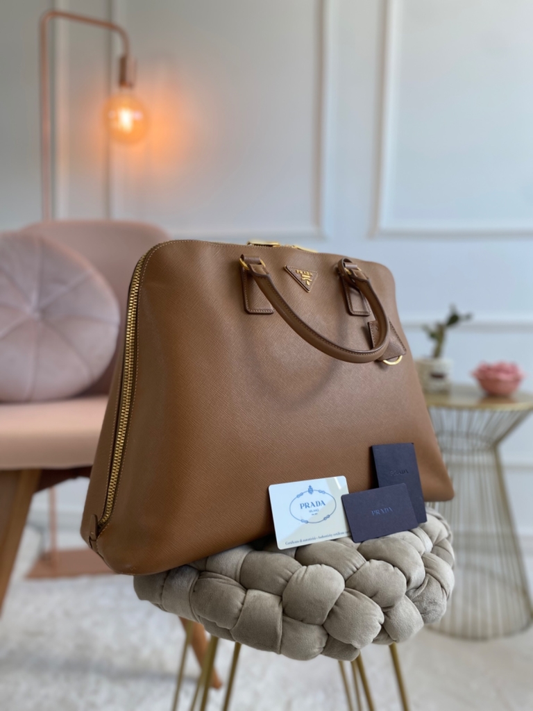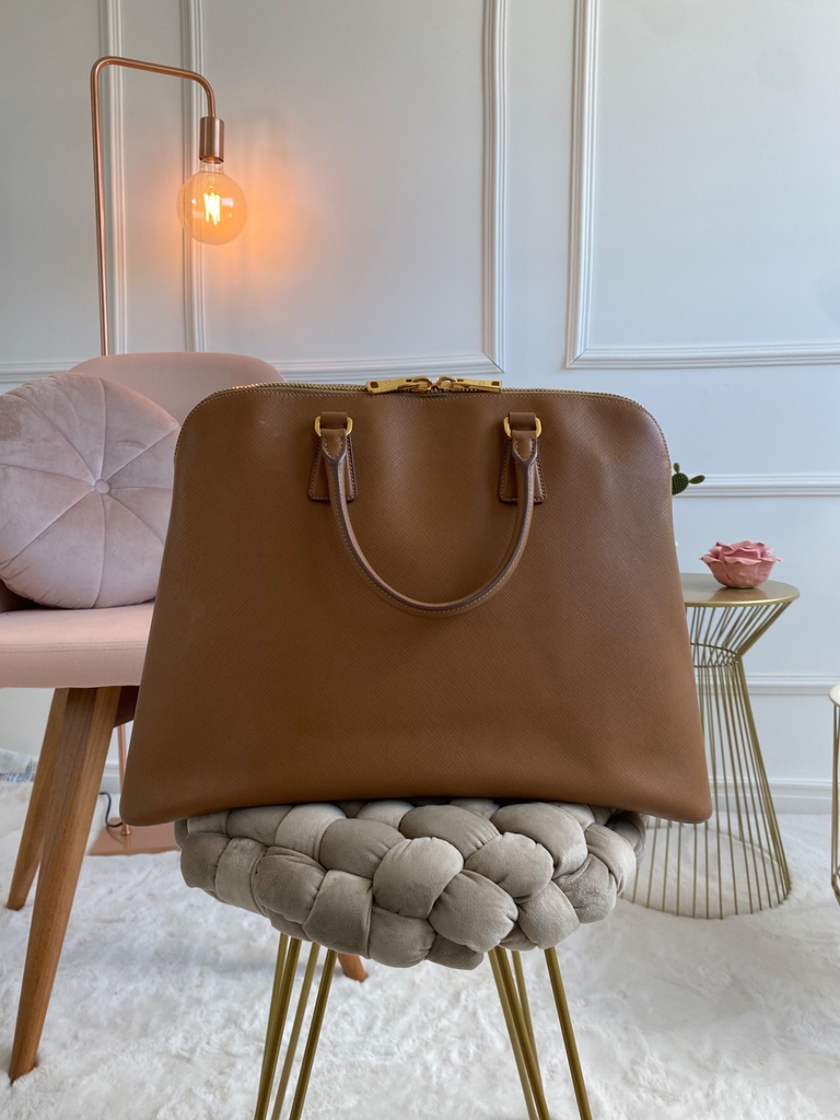 Bolsa Prada Saffiano bauletto em couro caramelo e ferragens douradas. O modelo conta com duas alças de mão estruturadas, dois compartimentos internos, três bolsos internos e fechamento principal por zíper.